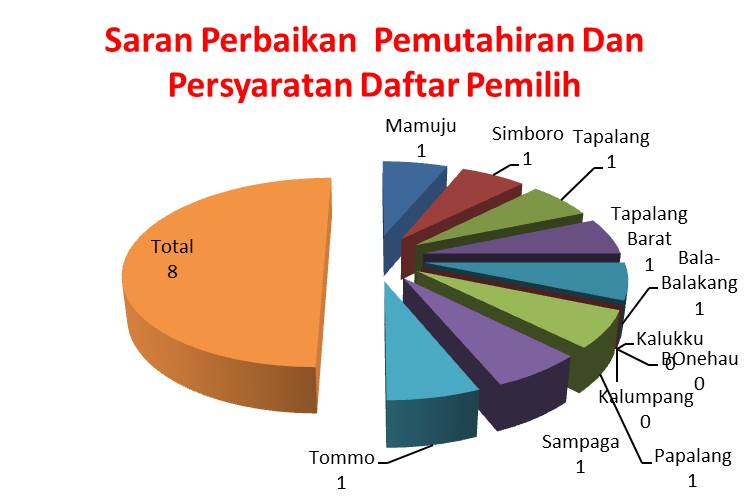 Bawaslu Kabupaten Mamuju juga mengeluarkan saran perbaikan pada Tahapan pemuktakhiran & penyusunan daftar pemilih sebagai langkah untuk mengantisipasi terjadinya tindak pelanggaran pemilihan di berbagai kecamatan dalam wilayah kerjanya. Saran ini mencerminkan distribusi rekomendasi yang diajukan Bawaslu untuk meningkatkan kualitas pelaksanaan Pemilihan Serentak Tahun 2024.