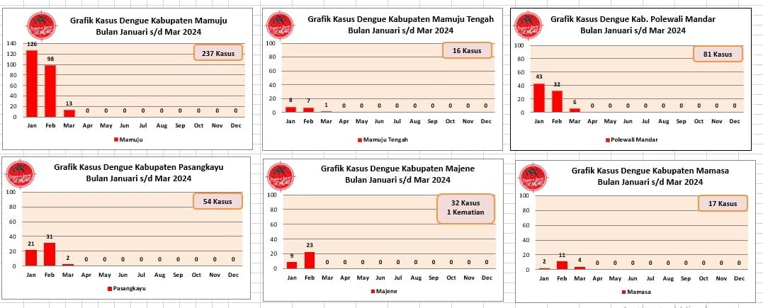 Untuk DBD pada Maret 2024, tercatat 26 kasus dengan rincian Mamuju 13 kasus, Polman 6 kasus, Mamasa 4 kasus, Mateng 1 asus, dan Majene 0 kasus.