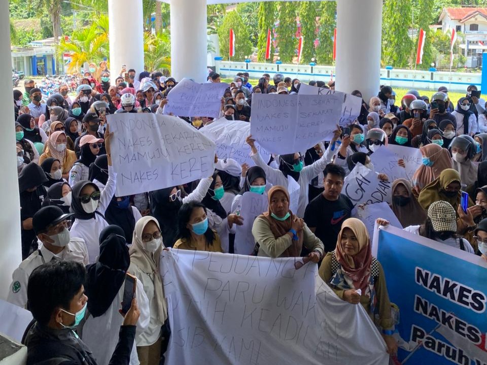 Massa aksi berangkat dari titik kumpul sekitar pukul 09.30 WITA dengan menggunakan mobil komando sambil berorasi. Setibanya di depan Kantor Bupati Mamuju, mereka membentangkan spanduk bertuliskan “Nakes jantung kesehatan, nakes mogok masyarakat sakit”.