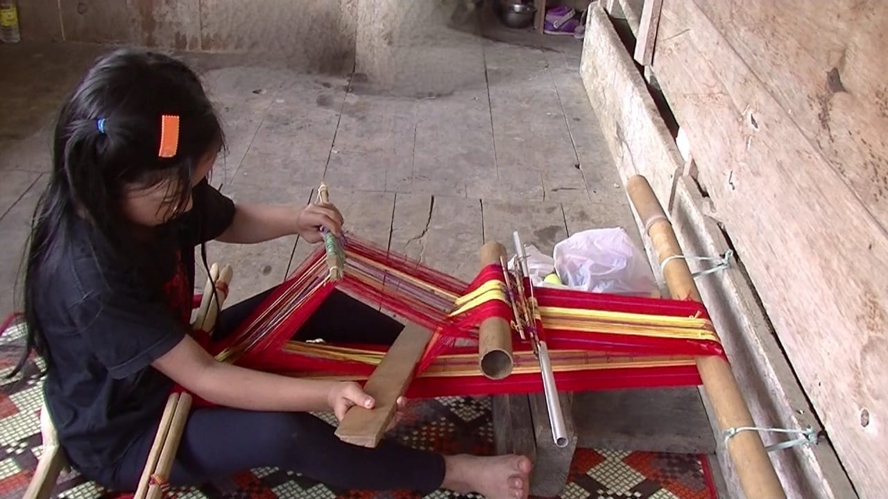 MAMASA, Mekora.id – Vivhia, seorang penenun gadis cilik berumur 7 tahun dari Desa Rantepuang, Kecamatan Sesenapadang, Kabupaten Mamasa, Sulawesi Barat, duduk tenang di atas lantai papan rumah panggungnya. Ia meraih serangkain benang berwarna merah dan kuning. Dengan seutas perkakas dari kayu Vivhia menyulam sebuah tenun khas dari Mamasa.