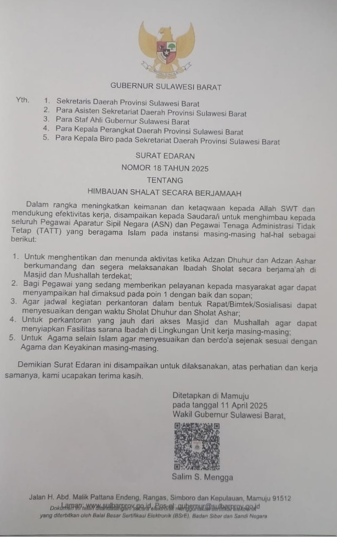 Dalam edaran itu, Wagub Sulbar meminta agar seluruh ASN Muslim menghentikan sementara aktivitas kerja saat Adzan Dzuhur dan Ashar berkumandang, lalu segera menunaikan shalat berjamaah di masjid atau mushalla terdekat.