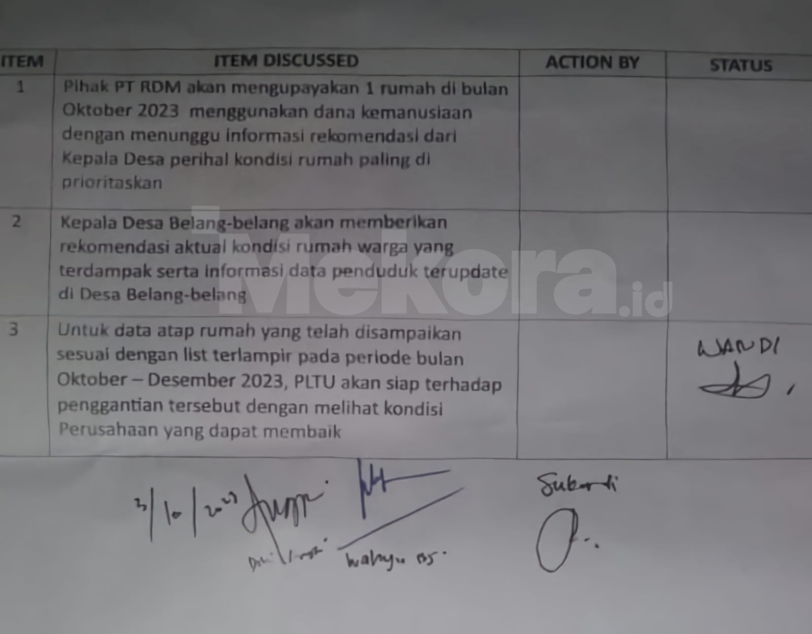 - Pihak PT RDM akan mengupayakan 1 Rumah di Bulan Oktober 2023 menggunakan dana kemanusiaan dengan menuggu informasi rekomendasi dari Kepala Desa (Belang-belang) perihal kondisi rumah paling diprioritaskan